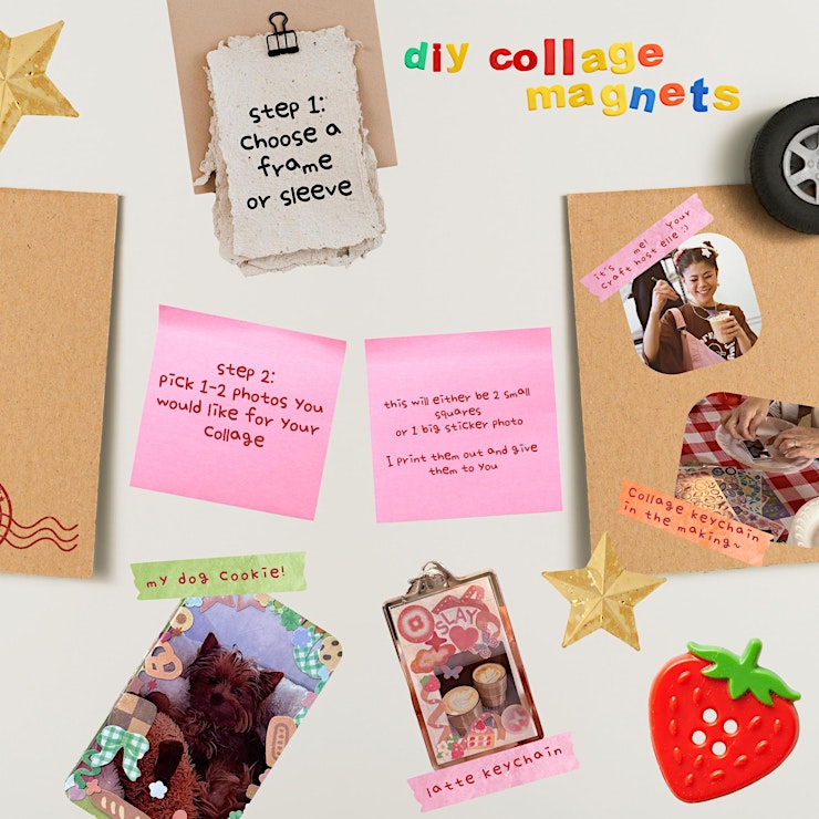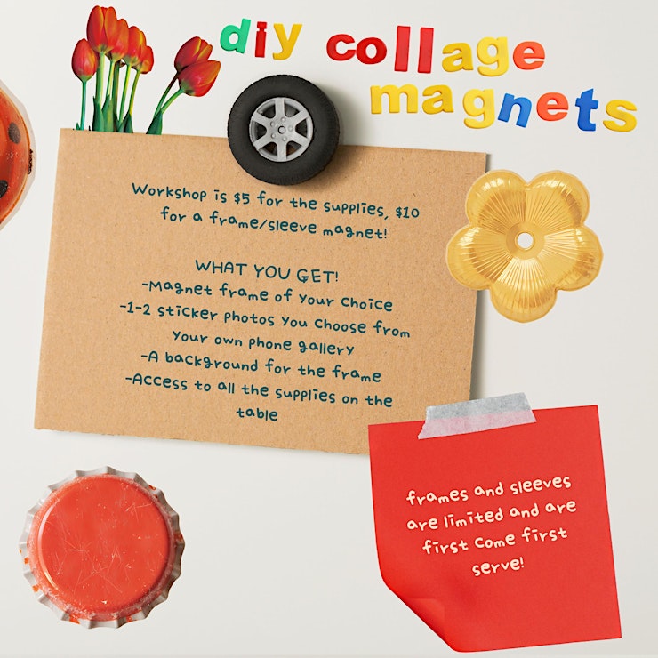 [post_content] => do you have a fridge that's in need of art? come through and make your own collage magnets with our friend, Elle!✨Decorate your own square collage to put into a frame that has been repurposed from the thrift store into a magnet for your fridge! (Or wherever) or choose to decorate a smaller collage to put into a sleeve that’s a magnet!