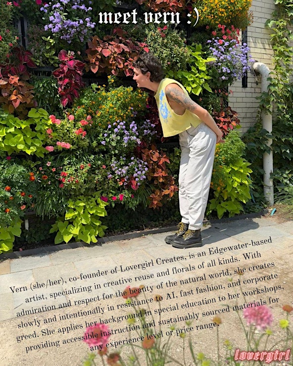Vern (she/her), co-founder of Lovergirl Creates, is an Edgewater-based artist, specializing in creative reuse and florals of all kinds. With admiration and respect for the beauty of the natural world, she creates slowly and intentionally in resistance to AI, fast fashion, and corporate greed. She applies her background in special education to her workshops, providing accessible instruction and sustainably sourced materials for any experience level or price range