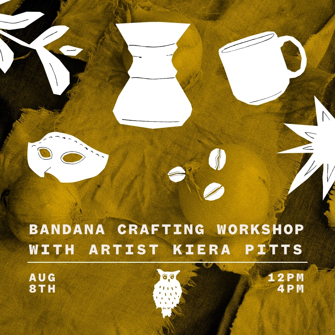 $30Join us for a short and delightful bandana crafting workshop with visiting artist Kiera Pitts! Attendees will have the opportunity to create their own bandana design utilizing 100% cotton Kiera has naturally dyed with a colorful array of willow leaves, onion skins, dandelion, and turmeric as the backdrop to a large array of her hand carved stamps! No prior experience is necessary to enjoy this hands-on experience at The Understudy. This workshop takes approximately 45 minutes. Each participant will go home with their own Understudy-inspired bandana.